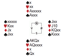 Fikk spar J ut. Hvis den går til spilleførers spar K, spiller ruter opp mot A, liten ruter til stjeling, spar til A, og siste ruter til stjeling. Pøs på med hjerter. til spilleren med spar Q vil trumfe. Hvis ikke blir han spilt inn på spar Q og spille opp i saks. Spilleren kan selvfølgelig blotte kløver K singel, men du har du kontroll og topper ut kløver K.