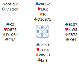 Mot slutten på turneringer kan det vel skje alle og enhver at blodsukkeret når bunnivå, og at de uttallige kaffekoppene endelig har fått deg dehydrert. Da er det ikke så mye som skal til før en har lurt seg sjøl. Etter dette spillet i nest siste runde tok jeg meg en sukkerbit.