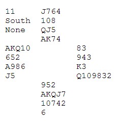 hvor vi var i 4 spar, og fikk ruter ut til esset. Mot oss skiftet han til hjerter, og vi gikk ei beit. Over halve salen hadde fått 11 stikk. Vi kunne selvsagt stoppet i 3 spar, men det hadde gitt 14 MP.