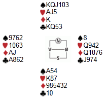 Jeg begynner nesten å bli lei av å skrive om turneringer som Helgemo - Helness vinner. Nå er det åpent mesterskap for lag i Frankrike og det ser ut som Zimmermann cruiser her også: HJEMMESIDE Jeg liker å prøve teste meg selv på meldeproblemer som dukker opp på BBO eller andre steder. "Hva ville jeg gjort ved bordet i den situasjonen?". Det er lærerrikt å se hvilke aksjoner de beste gjør likedan som meg og (minst) like lærerikt å se hvor vi skiller lag. I spillet under vant Geir Helgemo 12 IMP i sin kamp. Jeg må innrømme at jeg ikke ville vært i nærheten av de IMP'ene om jeg hadde sittet på Geir sin plass. Hva med deg? Motparten har kommet i 6sp. Der har du fem kort i mot og ellers INGEN stikk, verken i medspill eller motspill. Likevel melder Geir 7kl, til tross for at han ikke har den ringeste peiling på hvilke kort makker har !! Tor går sine 800, men det var en glimrende stamp mot 1430 på det andre bordet. Der kom de riktignok i hjerterkontrakt på vest sin hånd, men 6sp er også ubetelig, Jeg tror det er slike spill som er forskjellen meg meg/deg og de aller beste.