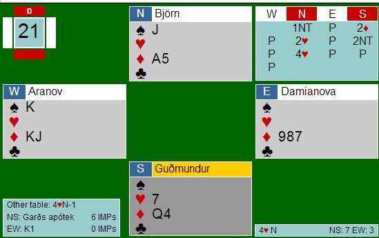 Det er ikke noe godt tegn fordi det betyr at det har ikke vært noen norske på lederbordet. Der har det vært stort sett islendinger og de spiller flott. Her er et eksempel der Damiinova fra Bulgaria gjorde feil som ble skjebnesvanger.