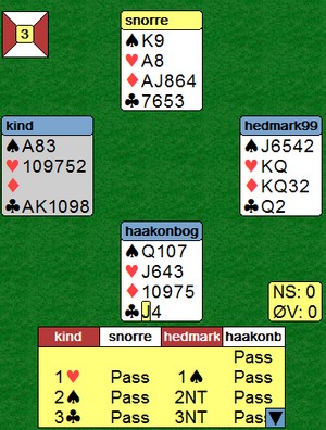 Asbjørn i vest har vist tre spar og normalt 3-5-1-4 fordeling. Makker Håkon Bogen spilte ut kløver knekt og da var den fargen klar. Roar stakk i bordet og fortsatte med hjerter til kongen og hjerter dame til mitt ess. Nå ser det naturlig ut å fortsette i ruter med det er masse som taler mot det. Hadde Håkon hatt en ruterhonnør, ville han spilt ut fargen og uten KD i ruter ville Roar neppe meldt 3NT. Da gjenstår det bare at makker må ha DJx eller D10x i spar. Derfor spar konge og ei beit.