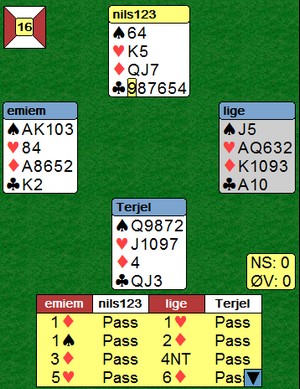 Hvis jeg ikke tar feil, er dette er av Bob Dylan's mange hits, men nok en gang er det bridge det handler om. For et par tiår siden var regelen for Blackwood omtrent slik: "4NT er spørsmål etter ess, unntatt i disse posisjonene... " så kom det noen få sekvenser som f.eks 1NT - 4NT og 2NT - 4NT. I dag har dette forandret seg mye og mange spiller med denne definisjonen: "4NT er naturlig invitt, unntatt i disse posisjonene..." så kommer det noen eksempler. Det vil føre for langt å gå inn og si noe kort om dette, men jeg tror det er mer bruk for 4NT som invitt enn som spørsmål etter ess, i alle fall de gangene det ikke opplagt er satt en trumffarge. Ikke minst fordi det nesten alltid er mulig å gå en omvei for å si at "dette skal være trumfen vår." Det er ingenting som er verre enn å spille 4NT med mange overstikk fordi makkerparet ikke er på bølgelengde, så jeg vil på det sterkeste anbefale å skynde seg langsomt. Lag noen enkle prinsipper for både når 4NT er Blackwood og når 4NT ikke er Blackwood. Selv liker jeg denne: "Hvis trumffargen enkelt kan støttes på tre- eller firetrinnet, er 4NT er naturlig invitt med en hånd som er for sterk til å melde 3NT." Her er et eksempel fra i går som jeg mener kan brukes som eksempel.