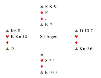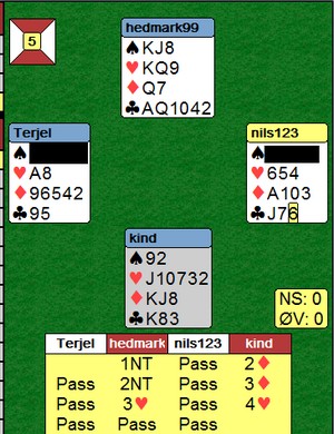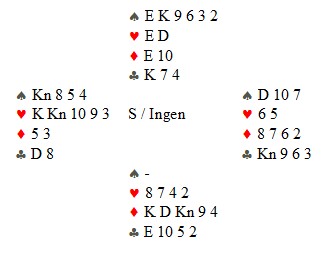 Det var mange morsomme spill denne kvelden, med gode spille- og meldepoenger. En hånd som voldte problemer for samtlige vest-spillere i lokalet var følgende: