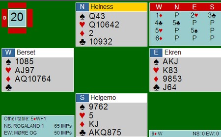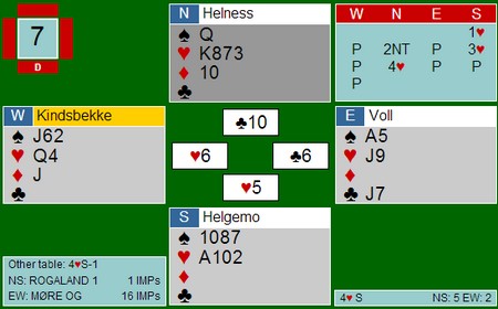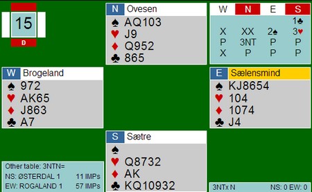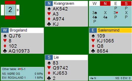 Søke etter 5-3 i major? Dette er et evig tilbakevennende tema. Makker åpner med 1NT og du kikker ned på hånda til venstre. Jeg vet ikke om noen har system til å finne ut først om makker har fem hjerter, så om han har bare tasser i spar ved siden av. Noen kikka ned på en sparhonnør og godt med honnørpoeng og meldte derfor 3NT rett inn. Andre søkte og fant (dessverre) makker med fem hjerter. Ser du under og litt til venstre skjønner du fort at 4hj ikke var rett kontrakt.