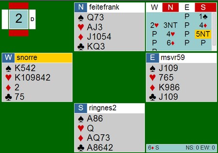 Hei SnorreEt lite spill jeg var veldig fornøyd med fra helgen. Dvs, det var vel meldingene jeg var happy med. Selve spillet var jo ikke så vanskelig med hj utSpill 20 siste halvrunde satt jeg med følgende:QJxxxxQxxxAxxMakker åpnet med 1ru og vi meldte videre i fred: 1sp 2kl - 2sp 4hj - 6sp