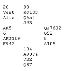 Uten tilpass synes jeg ikke hånda mi er verdt mer enn 2 spar. Da vokste jo makkers hånd til himmels. Synes makkers (Jørn Arild Ringseth) 4hj bud var godt. Siden han med sterke kort og 55 i minor ville meldt 3kl over 1sp så regnet jeg med at han hadde 3154. Det ble nokså enkelt for meg å melde slemmen. Den kan vel neppe være dårligere enn at den står på en kutt. Ellers var det jo hyggelig å få brukt konvensjonen for 28+ hp :) Der det sto 7NT hadde vi et relativt kjapt og effektivt forløp: 2ru (*Multi= avake to major eller diverse sterke hender) 2hj - 3sp (3sp = 28hp+) 7NT Er jo skummelt å åpne på multi med så mye hp, men i 4. hånd så skal det vel mye til for at jeg har søppelsvake2 i major :) Mvh Alexander Flakstad ______________________________________________________________________