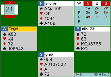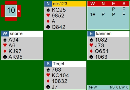 Det har Jan Tore Berg forstått. Selv om han har tre spar til makker og dermed åttekort tilpass, ser han om makker kan støtte i hjerter. Syvkortfarger egner seg som regel MYE bedre som trumf enn som sidefarger. Nå tror jeg det går an å vinne 4sp med litt forsiktig i spilleføring, men 4hj ga i alle fall ingen problemer. Alle som spilte 4sp gikk beit. Det kommer ruter ut og så er det slettes ikke rett fram etter nesa