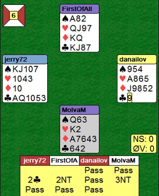 Nei, det er ikke smygkasino jeg snakker om, men bridge. Dette morsomme spillet så jeg på BBO i går. Jeg tror vest var irritert på makkeren sin som ikke fant sparskiftet, men han kunne klart det selv. I alle fall nesten.