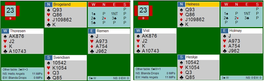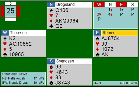 og denne gangen er det Tonje Brogeland som får skryt. Jeg likte 4ru MEGET godt og jeg kan ikke se hvordan ØV skal kunne melde verken 4hj eller 4sp. Ved det andre bordet var nord med til bare 3ru og da fikk øst meldt en gang til. Bra pressa, fru Brogeland!