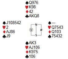 Som syd har du havnet i 3 hjerter, og det kommer to ganger kløver, liten ruter til dama og ruter til esset ut. Tredje ruteren vinner du i bordet, og nå må du få hjem resten.