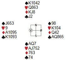 Det var BBO overføring i helga og jeg skal prøve å finne noen interessante spill. Jeg starter med et som handler om ikke å finne opp kruttet på nytt. Bridge er faktisk enklere enn mange tror og de reglene som har etablert seg som sannheter, er ofte det beste. Jeg kan på en måte forstå at Siv Thoresen åpner med 1NT fordi hun vil få et gjenmeldingsproblem hvis øst svarer noe annet enn 1sp. Over 1hj vil hun i første omgang melde 1sp, men så kan det bli vanskelig etterpå å vise styrken. Svarer makker 1NT eller 2kl må hun sannynligvis velge mellom å reversere svært tynt eller gjenmelde 2ru. Ingen av delene yter hånda rettfedighet. Nå åpnet hun med 1NT og jeg kan på en måte også forstå at Sølvi passer 2sp. Hun har riktignok fin tilpass og et par dobbelton'er, men damer er ikke det beste å ha i bridge. På det andre bordet trodde vel alle at dette skulle bli et buttspill, men det ble en soneutgang i pluss for å følge den allerede oppgåtte stien. Over var det Gunn Tove Vist som vurderte hånda bedre enn Siv Thoresen. Her var det motsatt og 5kl var verre å melde enn å spille hjem. Noen ganger blir jeg mørkredd når jeg ser på bridge. Se på spillet under og gjett på:
