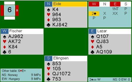er den sterkeste juniorturneringa utenom mesterskapene. Turneringa spilles i Nederland hver vår og Norge pleier å stille med sine beste unge spillere. Denne ganger er det Harald Eide - Kristian B Ellingsen og Kristoffer Hegge - Christian Bakke som er våre representanter. Du kan følge spillinga på BBO. I første omgang er det 10 spills Round Robin, alle mot alle, før sluttspillet mellom de fire beste starter på torsdag. Jeg er ikke helt sikker på hvordan semifinalene spilles, men jeg tipper vinneren får velge seg motstand. RESULTATER INNLEDENDE SWISS - RR - BUTLER Redobla overstikk holder ikke.. Scoren 1160 er ikke den mest kjente, men det er 2klxx med et overstikk i sonen. Den måtte de Harald og Kristian betale ut etter å ha doblet Stayman. Det gjorde ingenting siden Christian og Kristoffer på det andre bordet lett meldte 6hj. En syver inn!