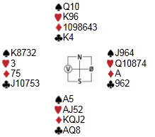 Og Vest kunne ikke holde tre hjerter sammen med kløver 10 gardert. Ved bordet kastet han en hjerter. Kløver dame og tre hjerter fra topp ga kontrakt.