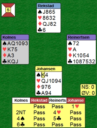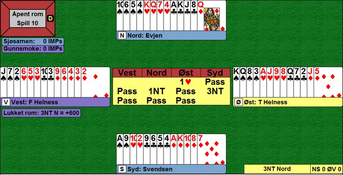 Tor Helness spilte ut spar konge til esset. Makker Fredrik la toeren som styrke. Så kløver til knekt og dame, spar til knekten og mer spar som gjennomspilte spilleførers tier. Hjerter ess og en beit. Hva er poenget her da? Jo, kanskje skal Tor ta for hjerteresset før han spiller spar til makkers knekt. Kunne ikke Tor hatt f.eks KD63 i spar og ED i hjerter sånn at det var hjerter som skulle tilbake? Nei, sånn er det ikke. Da tar Tor for spar dame og spiller spar til makkers knekt. Nå kommer det hjerter tilbake hvis det er rett.