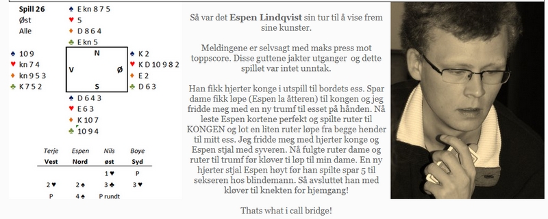 Jeg håper ikke Nils blir fornærmet når jeg stjeler artikler fra han. Betalingen min er stadige oppfordringer om å lese en bridgeside som inneholder drøssevis av spill med gode poenger. Her er det Espen Lindqvist som får fortjent skryt. Det hele handler om hvordan ruteren skal spilles for en taper. Øst har vært ute og sladret i kortene. Han har fortalt om normalt minst ni kort i hjerter/kløver og brorparten av honnørpunktene. Det benyttet Espen seg av når han skulle vinne sine ti stikk. Referatet av spillets gang leser du over, så det gjentar jeg ikke. Et fint poeng av Espen der han bruker at siden vest har lengden i ruter, er det størst sjanse for at et manglende kort (knekten) sitter på den hånda. Derfor ruter til kongen. Min kommentar går til øst sin aksjon. I bridge må en alltid tenke to tanker. "Skal jeg undersøke eget potensiale eller skal jeg tenke mest på å hindre motparten i å utveksle informajon?" Nils ønsket å komme med en egen utgangsinvitt og ba makker se om han kunne hjelpe til i kløver og hvordan det ellers sto til med honnørstyrken. I bridge er det som regel en god ting å ta makker med på råd, men samtidig gir en motparten plass til å utveksle sin informasjon. Nils ville ikke melde 3hj fordi det var fight om kontrakten. EK i kløver og noen små hjerter var alt han trengte for å 4hj skulle være kabal. Å hoppe rett i 4hj var også et aldri så lite overgrep. Nå fikk Boye slippe til med en invitt for sin side når han meldte 3hj. Espen Lindqvist er ikke tung å be, ikke minst fordi det kunne se ut som makker hadde singel hjerter og at siden ØV hadde hjerter/kløver, kunne makker godt ha noe rutertilpass. (KJx i ruter hadde gjort spillet nedbrett) Nok et bevis på at det som er teoretetisk korrekt (3kl) i praksis ikke er det vinnende budet (3hj). Da hadde syd meldt 3sp og det ville gått pass rundt.