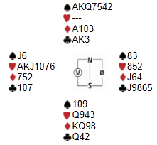 Jeg har like så gjerne vist alle kortene, at det er 13 stikk i spar NS er ingen hemmelighet, spørsmålet er hvordan man kommer seg dit. Det er to scenarioer du må ta stilling til. Enten åpner vest med svake 2 hjerter, eller passer i første runde og melder inn hjerter ved neste anledning.