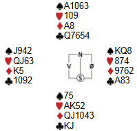For i dag var var det 5,5 bord som spilte kort. Det er noen lokale medlemmer som mangler, bl.a PJ som er på jentebesøk i det store utland. Fikk forresten en melding av han idag, det sto; "Bridge er som sex; Enten trenger man en god partner eller en god hånd" Vel...vet ikke om det var tilfeldig den meldingen kom i dag, men jeg lar sitatet tale for seg selv...over til bridgen. J. Eidissen spilte med Arna og kom på 3 plass. Ola og Olav fra Sølvknekt havnet på plassen foran, mens Vetle og Morten T. vant stort. Grattis til alle! Jeg må si det alltid er mye armer og bein når Vetle er ved bordet (og utenfor) men alltid med et glis om munnen, spesielt når det går så bra som i dag. Men litt god bridge er det jo innimellom, her kommer to spill der det gjelder å lytte på motpartens meldinger og missbruke det til ditt beste;