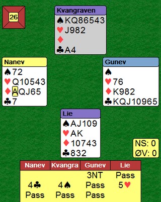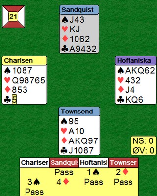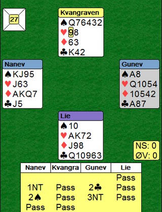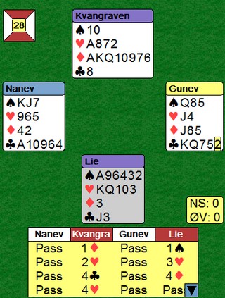 Denne kampen var den andre i Round Robin fra Ungarn. I den første kampen vant Norge 13.75 - 6.25 mot Norge/Nederland. En fin start for våre gutter. I kampen mot deButton var det en skrekkelig start for de norske. Jeg liker helst å skrive om gode prestasjoner, men jeg må nesten også referere når de er triste saker som vises. Det gikk litt bedre etter hvert når Norge meldte et par gode delkontrakter der engelskmennene peisa på til utganger som sto på veldig mye. Dobbeltscorer på 140 i 3sp mot -100 i utgang er det samme som en utgangssving utenfor sonen. Kampen endte likevel 65 - 28 til deButton.