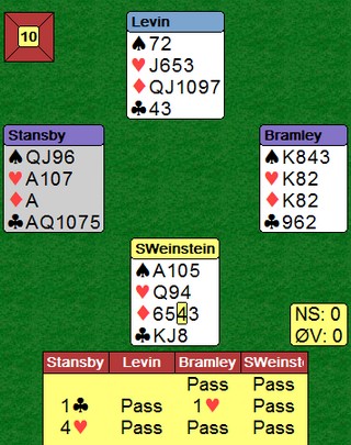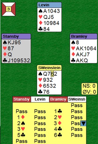 Der nærmer de seg slutten på kvalifiseringen for VM. Semifinalen er snart ferdig, men det er jevnt i begge kampene. RESULTATER. Her er to spill fra kampen mellom Nickell og Bramley. Når du leser overskriften, skjønner du sikkert hva jeg mener. Sterk kløver og selv om Bramley melder tredje farge med bare EKD; regner han med at makker har fem for å støtte. God naturlig logikk.. Ja, det er semifinalen i det amerikanske mesterskapet.