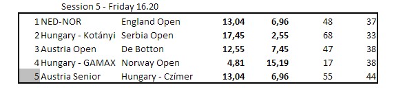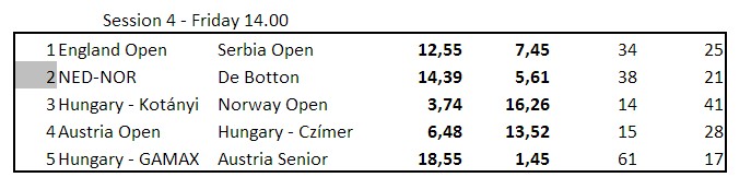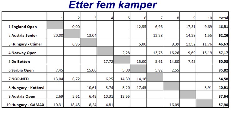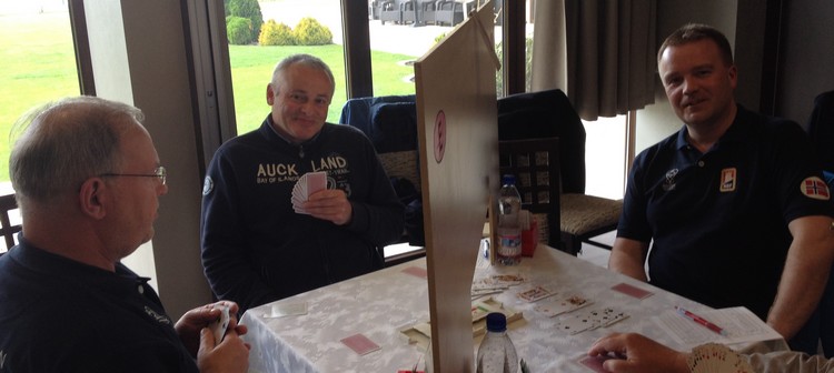 etter de tre første kampene. Her er hva han skriver selv: "Hei Snurr. Her kommer noen bilder, men har bare iphone så billdene er litt dårlig kvalitet, men bare bruke det du vil her. vil oppdatere etterhvert som vi får tatt fler. Hiver ut spill og historier på web, bare "stjel" derfra også :) Det var en trist andre kamp i går, men ok første idag. Jeg brente en slem som "selvsagt" var opplagt å melde, du ser vel for deg leppa går.... hehe, men veldig bra stemning mellom spillerne. fin trening. Men jeg må løfte nivået skal vi henge med, blitt for mange feil som koster så langt" En skal kanskje ikke legge all vekt på butler, men det gir et korrekt bilde av hvordan en har prestert i forhold til de andre parene. Noen ganger er motparten flink og noen ganger har en uflaks. I det lange løp vil dette jevne seg ut og butleren gir et tilnærmet riktig bilde av egne prestasjoner over tid. Thor Erik og Thomas har så langt over middels i alle kampene og et snitt på omtrent 0,75. Nils og Terje har omtrent like mye minus pr. spilte spill. Skal vi komme til semifinalen, må de opp i kvalitet. Nils skriver på SIN EGEN HJEMMESIDE. Lesverdig Her er noen bilder Nils har sendt fra Ungarn