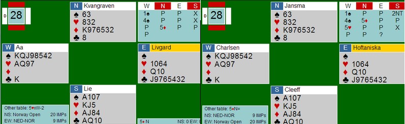 mellom seier og tap. Dette ene spillet var nok til å snu resultatet mellom Norge og Norge/Nederland i Ungarn. Det var avgjørelser som kan diskuteres ved begge bord, uten at jeg skal felle noen dom over hva som er mer rett enn noe annet. I åpent melder Nils 5ru og spiller hjem den (velg spill 28 hvis det ikke kommer opp direkte) på en glimrende måte etter kløver 9 i utspill fra Allan. Noen vil sikkert si å spille ut fra en åttekortfarge ikke er veldig aggressivt og at hjerter ut beiter. Kløver 9 gir informasjon til makker at "Jeg har ikke noe i den fargen", men kanskje er det info spillefører har mer bruk for enn makker? Jeg undrer meg også litt over 5hj fra Thomas. Det er i alle fall superaggressivt for å vinne en kontrakt på 5-trinnet og er rett bare når makker har fem hjerter, til nød fire selv om trumfmatten lyser i mot selv på 4-4. Noen sier at Hoffa skulle preferert på renons i spar fordi makker har MYE lenger spar enn hjerter etter dette meldingsforløpet. Det er skrivebordsbridge. Under over alle under får Thomas skrape samen ni stikk og vinner 600 -300 = 320 og en syver inn. Med hjerter ut fra Allan mot 5ru og et bedre motspill mot 5hjx, hadde det bli 50 + 800 = 850 og 14 IMP ut. Den svingen hadde snudd hele kampen.