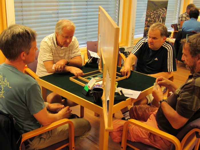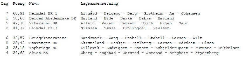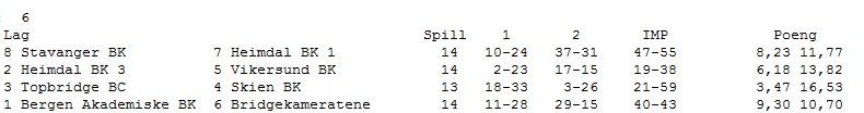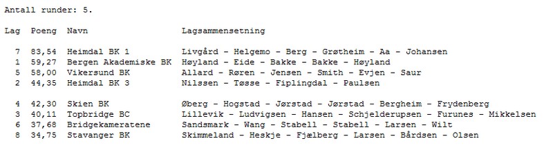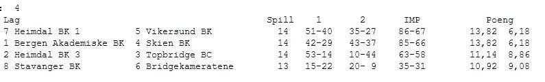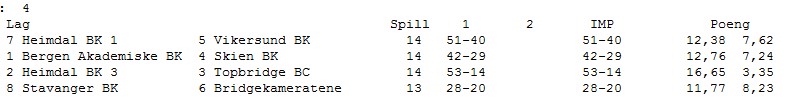 KAMP 5 Det er et ønske fra arrangøren at alle lagene skal spille minst en kamp på BBO. Derfor ble det et bytte denne runden slik at BAK mot Vikersund ble sendt. Denne kampen ser ut til å bli avgjørende for kampen om sølv og bronse. I neste runde (kamp 6) er det Stavanger sin tur. Det blir ikke så mye referat fra denne kampen. Nå har jeg sittet tjue timer mer eller mindre sammenhengende og tar kvelden fri. Resultater følger du i linken over og det kommer hit også når spillinga er over. I morgen skal det avgjøres med to kamper, men som sagt før er vel gullet langt nede i lomma på Heimdal 1 allerede. Her fra kampen mellom Heimdal 3 og Bridgekameratene STILLINGEN ETTER KAMP 5 RESULTATER KAMP 5