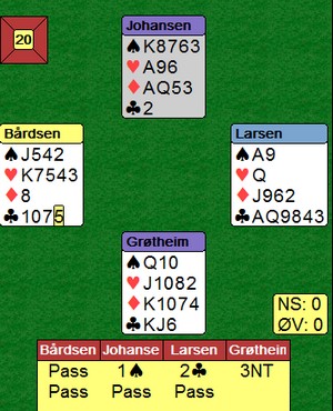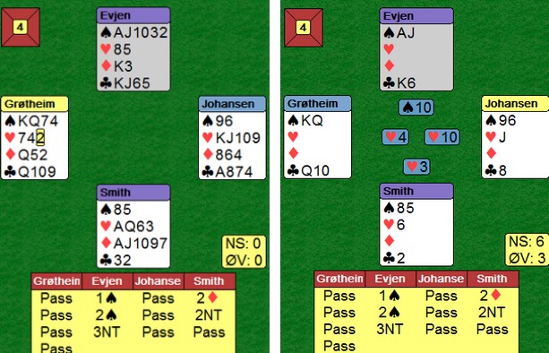 Dette er toppbridge, folkens!! Følg med hva som skjedde. Glenn spiller ut hjerter 2 og finner makkers farge. Syd stikker og bommer ruteren, noe som ser naturlig ut. Mer hjerter som syd vinner. Han tar tre ruterstikk og spille kløver til knekten. På de to ruterne, kasta Lars Arthur to kløvere og har med det latt makker i stikken med holdet i begge svartfargene. Det kunne vært kritisk, men ikke når du har sånn oversikt som nordlendingen. I posisjonen over til høyre, tar han for hjerter 10, men IKKE hjerter knekt !! Du ser helt sikkert hva som skjer med makker hvis LA tar deres fjerde stikk med hjerter knekt. I stedet frir han seg i kløver og en beit. Glimrende bridge!! På det andre bordet er utspillet også hjerter til kapp, men Erik Berg spiller i stikk to spar til tieren som holder og kan så gå tilbake til ruteren. Det ender med 10 stikk og 12 IMP til Trøndelag.