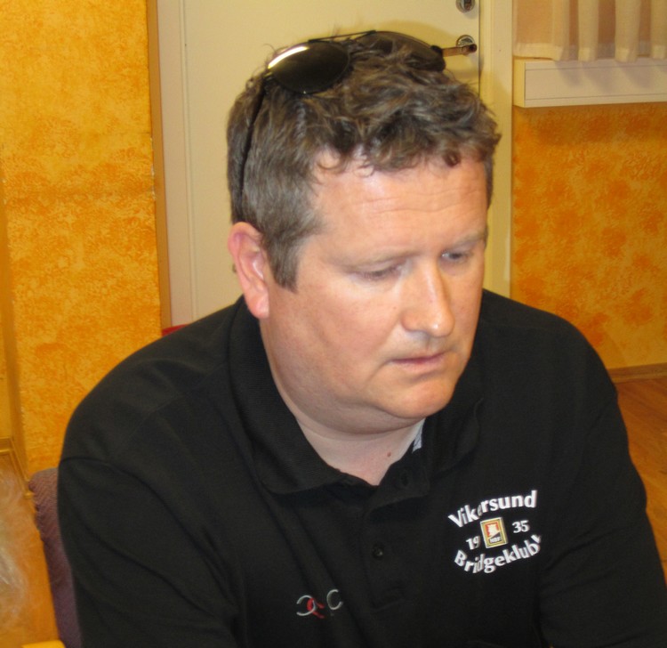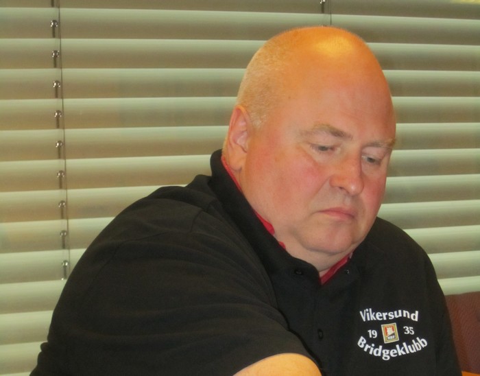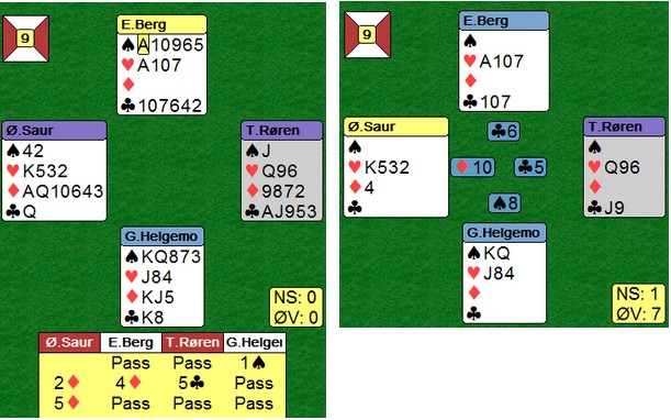Så en god (heldig?) slem av Heimdal. Øyvind Saur fikk sparkongen ut til esset. Han fortsatte med ruter til bordet og kløver til kongen (!). Han tenkte sikkert slik at hvis en var kort i kløver, var det sikkert syd som hoppet til 3sp. Nå kunne ikke 3NT vinnes lenger. På det andre bordet la Glenn Grøtheim ned kløveresset tidlig og da spilte resten seg selv. D10xx kunne fanges opp og en hjerter forsvant på ruteren. Hjerteresset satt foran kongen og +920. Den scoren tror jeg ikke mange slår. Så var det Vikesund sin tur til å melde slem