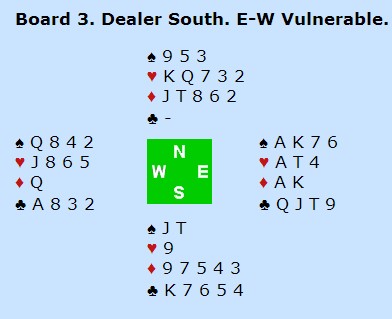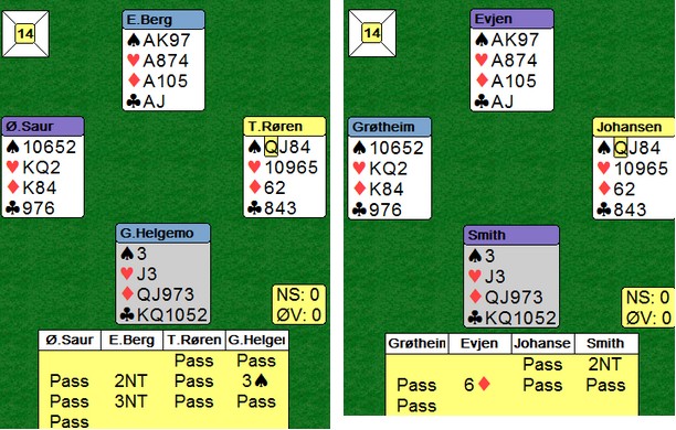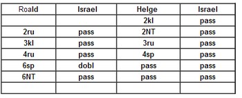 Det var langt fra alle parene som meldte denne slemmen og der Helge og Roald Mæsel spilte, var det over 25 IMP i sving på å gjøre rett. Israel stoppet i 3NT i åpent rom. Helge oppvurderte hånda til 22-23 NT med den fine kløveren og ingen lavhonnører ellers. Da plasserte Roald seg i 6sp, men skjønte at nord var renons i kløver. Et fint uttak i 6NT redda ei SVÆR bøtte med poeng til Norge.