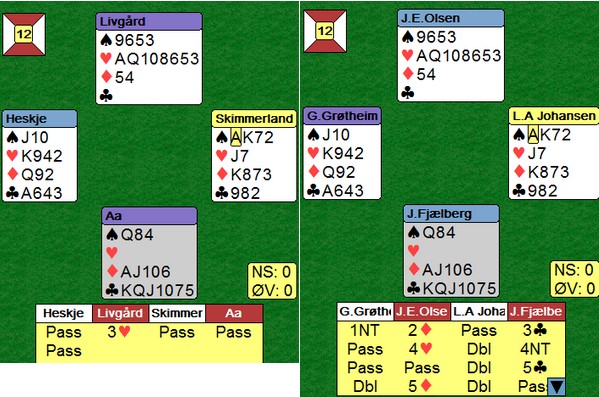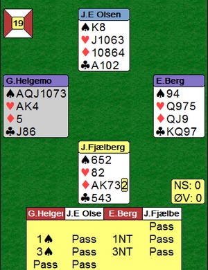 "Right from after the nose.." 2NT viser begge minor og det var alt Sigurd Evjen trengte. 3sp av Geir viste også minor, men Erik Berg i nord hadde for mye major til å ta i mot?