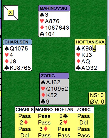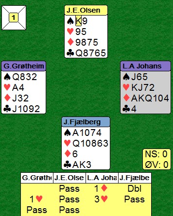 Jeg vet ikke om Tormod Røren skulle dobla 4hj. Han vet at det er masse beit der, men på den annen side kam motparten ha en annen kontrakt som er mye bedre. Øyvind Saur hadde store ekstra ressurser for sin 4kl. Det er lett i etterkant å si at Tormod skulle doblet, men la nå oss si at motparten hadde ti stikk i spar som de flykta til. DA hadde vi ledd av landslagskapteinen da!!