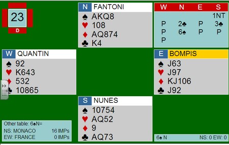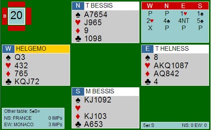 og da finner de vel ut av det de trenger? Nei, dessverre er det ikke alltid lengden det kommer an på. Fredrik Nystrøm hadde et spørsmål til makker. "Hvis du sparkontroll og et ess, da kan vi spille 6kl?" . Han fikk for så vidt svar på det han lurte på, men da var de allerede i 5ru! Noen ganger er det best å spill 1430 svar på Blackwood, mens andre ganger er det 0314 som funker. Nå prøvde de å buklande i 5NT, men Bessis var frampå med rødlappen når han skjønte at makker hadde majoressene. Hans hjerterkonge var beita i 5NT, denne gangen mange beit om NS hadde stoppet der. På det andre bordet gikk det omtrent likt til syd hadde reversert i ruter. Da hoppa nord til 5kl og meldingene stoppa der. Jeg skal ikke lære noen i hele verden å melde, men jeg føler at svensken i nord avga minst et cuebid for mye med sin essløse hånd. Det er noen som mener at cuebid under utgang ikke nødvendigvis viser tillegg, men hvordan skal syd vite om nord har Exx,Exxx,x,xxxxx (7kl er nedbrett) eller den hånda han har?