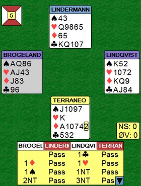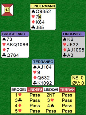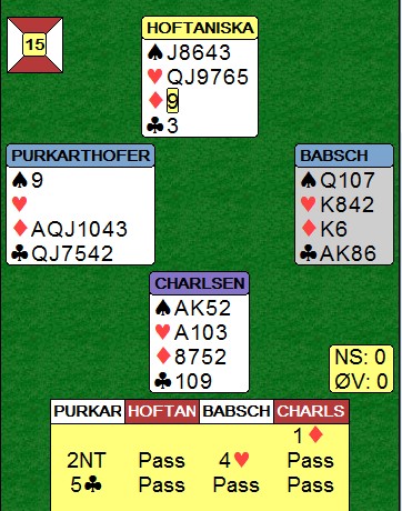 Boye briljerer i 5 hjerter! I spill 12 melde østerrikerne altfor hardt og havnet i en steindød 6 hjerter. Boye og Espen tok det litt mer med ro, men klarte ikke å stoppe før i 5 hjerter. Men selv der var det problemer. Med spar ut ville kontrakten vært sjanseløs, men med trumf ut fikk Boye sjansen:
