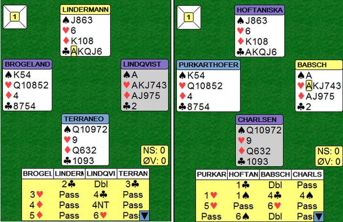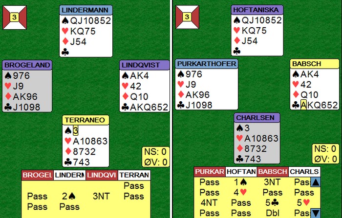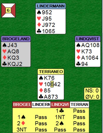 Først åpner Espen tynt på 10 honnørpoeng og Boye sperrer med 3 hjerter. Allerede nå tror spillefører at honnørpoengene er fordelt med flere poeng hos Espen og færre hos Boye. Spillefører har to sikre rutertapere og må spille kløveren for 1 taper. Det klarer du normalt bare om damen sitter i kutt, men Espen ga spillefører et valg! Han tok for ess og konge i ruter i utspillet. På den første ruteren la Boye svakhet som indikerer 3 eller 4 kort i fargen uten damen. Videre fulgte han opp med sekseren på kongen, det laveste kortet som er igjen ute. Med dobbelton hadde Boye lagt sekseren som styrke først, da han i så fall vil at Espen spiller tre runder ruter til stjeling. Når Boye valgte ruter 6 i andre stikk frem for ruter 8 betyr det at han har noe i kløver. Espen ser at dette bare kan være esset og spiller flott en liten kløver fra damen! Spillefører har nå fått et avkast på ruterknekt til en kløver, så han må bare gjette hvem som har kløveress og hvem som har kløverdame. Et så pent motspill fortjener selvfølgelig at han bommer. Etter en liten tenkepause valgte spillefører kongen og 12 imp til Norge da Hoftaniska valgte rett i kløver på det andre bordet.