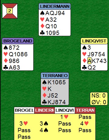 som de sier her på sørlandet. Espen tar for EK i ruter og godspiller først et ruterstikk hos spillefører før han skifter til kløver to. "Å, neida!", tenker spillefører. "Du lurer ikke meg fordi du har tross alt åpnet", og går opp på kongen. En beit!!