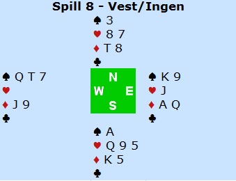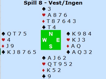 NIls makker, Terje Lie har gjort oss oppmerksom på dette spillet fra EM-oppkjøringen mot Roar Voll og Asbjørn Kindsbekken. Spillet er publisert på bloggen til Nils, og Terje sa "veldig bra, makker" da spillet var over.