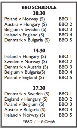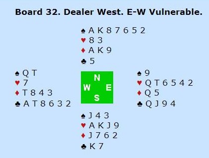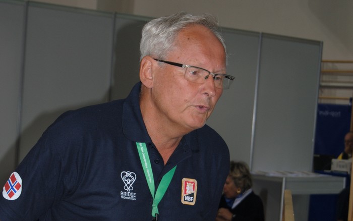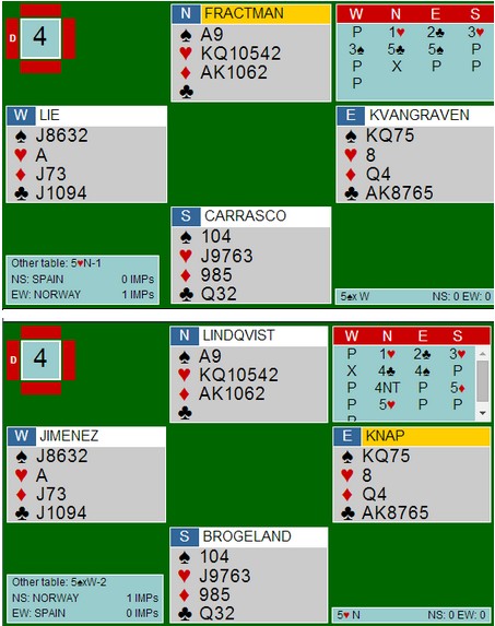 I spillet under fikk alle tolv eller tretten stikk. Espen Lindqvist fikk bare elleve og da må vel han være veldig dårlig? Det er Petter Haram som har sendt meg en mail som forteller at Norge fikk ruter fem (!!) i utspill. Den gikk til liten, tier og ess. Espen prøvde både kløver mot kongen og tre ganger hjerter til stjeling, men da ingenting av det gikk bra skjønner du helt sikkert hva som skjedde siden Espen har ruter 9 på hånda.