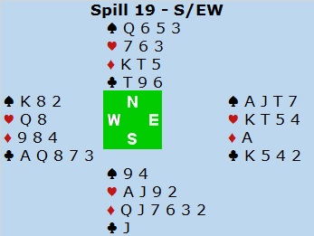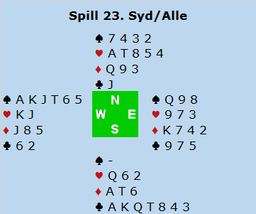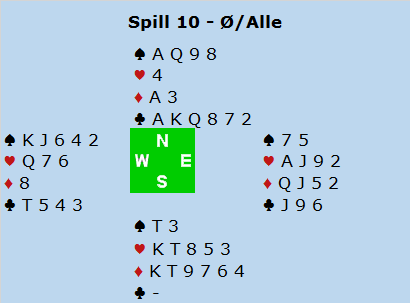 * passen til Espen viste 4+ hp, dbl ville vist 0-3 hp * 4 hjerter nå viser cuebid siden han ikke meldte hjerter forrige gang Mange vil vel kanskje si at hånda til Boye ikke kvalifiserer til en sterk 2 kløver, men han håpet nok at det kanskje ville holde motparten ute av meldingsforløpet. Det gjorde det ikke, og når Espen sleminviterte med cuebid 4 hjerter måtte han nesten slå av. Men Espen hadde tro på slem og løftet et hakk. Med ruter ut må Boye treffe den fargen i stikk 1, men uten ruter ut er slemmen faktisk ganske god. Du er avhengig av å løse hjerterfargen for 4 stikk, men du må samtidig sørge for at hjerteresset er inntaket. I prinsippet betyr det at du må spille hjerter til tieren og håpe den taper til kongen, eventuelt at det sitter KJ foran. Denne gangen løste det seg for våre gutter og 13 imp inn!