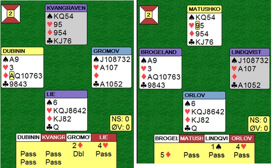 Kampen starter bra når Nils og Terje melder en fin slem i spill 1. De har bra kontroll på systemet sitt. Butt spill. Det smalt allerede i spill to der Terje Lie tok vel mye Møllers tran. I alle fall når Nils hadde utstyrt seg med en helt ubrukelig hånd. Boye valgt å melde 5ru, en aksjon som ser rimelig naturlig ut. Også han fant en makker med kort som ikke kunne brukes til noe særlig. 800 + 150 i beiter og 14 IMP ut. Så var det Nils som tok mye Møllers tran, men han fant makker med de rette korta. KJ i hjerter og kløveresset var snadder. Russeren i øst var flink og stampet sånn at han redda 1430 til 1100. Espen stamper over 5sp og går 800. (eller var han ikke sikker på om de var inne i en kravpass-posisjon? Det kan se ut som Boye bløffa med 4NT) Her skjønner jeg hvordan Nils tenker, men nok en gang hadde makker helt andre kort enn ønsket.