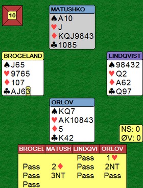 Russeren var heldigvis dårligere (?) enn Terje Lie, så Orlov gikk inn på sparesset og spilte på hjerteren (!) i 3NT. Der er en avhengig av kappen pluss 3-3 sits. I ruter mangler det bare at tieren ikke gir stikk. En heldig utgangssving til Norge siden Boye og Espen fikk tre i kløver, hjerter 9 og ruteresset Det kan se ut som at flere og flere (de norske også) spiller invitt mot NT. Utspillet forteller ingenting om antall kort i fargen. Se hvor mye verre det er å få kløver 3 som invitt enn kløver seks som norske. Enda lettere om kløver 3 er "fjerde høyeste" Boye prøver også Det har vært skrevet om minst tre spill der det var rett å spille ut et liten fra Hx. Boye skulle ikke være dårligere og startet med hjerter 5 (!). Det ble et voldsomt tempotap i forhold til å begynne med den normale kløverkongen. Med kløver ut ser det skummelt ut å gå på trumfen (den sitter jo ikke alltid 3-3), så spillefører starter nok i ruter. Bommer han den, blir det beit.st Uansett kan vest gi øst to stjelinger. Nå tusta motspillet seg til og det hele endte med ni stikk. Kampen ebber ut med 41-25 til Russland. Nils og Terje hadde 800 inn i nest siste, men valgte en normal 5ru for 600 i stedet. Butt spill. Boye spiller rart mot 2ru i siste og stikker makkers stikk. Han hadde sikkert en plan, men pasienten døde og kontrakten gikk hjem. Det var bare 2ru, men 4 IMP er et vinnerpoeng det også i jevne kamper.