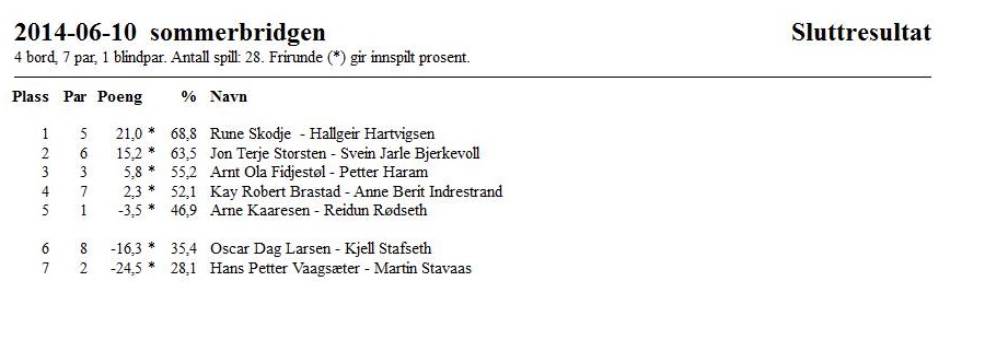 Resultatene når det dårligste resultatet er strøket ligger i egen fane, mens resultatene for alle kveldene ligger i bunn av resultater.