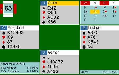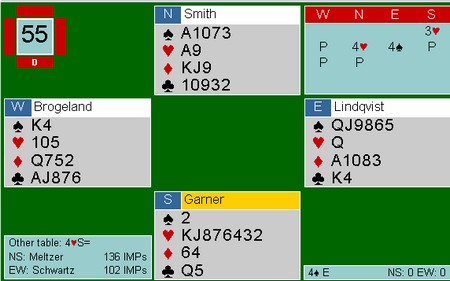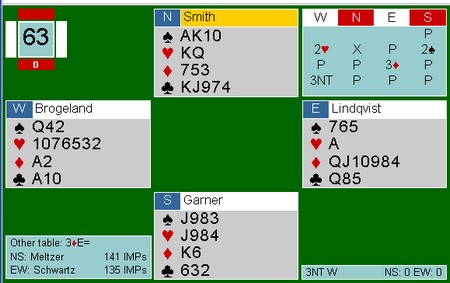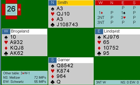 Lagturneringene i de amerikanske mesterskapene er noe av det tøffeste det går an å begi seg inn på, og det er en meget sterk prestasjon å gå hele veien fram til en finale. Semifinalen i årets sommermesterskap - Spingold ble spilt i natt, og begge finallagene har norsk deltakelse - jeg kan ikke huske at det noensinne har skjedd før. Monaco med Geir og Tor tok seg forholdsvis lett til finalen, men i den andre ble det ulidelig spennende. Boye Brogeland og Espen Lindqvist spiller på lag Schwarts, og en gedigen spurt av dem gjorde at de tok seg til semifinale. Der var det utrolig jevnt helt til siste kort. Med ett spill igjen ledet laget med to imp! Schwarts N-S meldte en ganske standar 4 spar med 10 stikk, og vi som så på trodde det var greit. Etter NT-åpning hos Nord meldte imidlertid Espen inn Multi 2 ruter i sonen ,og Boye ble spillefører i 2 hjerter doblet. To bet ville gi finaleplass mens tre bet ville gi tap. Etter litt snilt motspill ble det kun en bet, og dermed kunne vi tilskuere og spillerne puste lettet ut. Finalen spilles i kveld kl 20, og alt kan følges på BBO.
