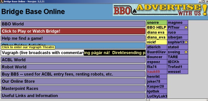 Lagturneringa i det amerikanske Summer Nationals, "Spingold", er ved siden av Cavendish den konkurransen bridgespillere helst vil vinne. I natt gikk lag Schwatz med blant annet Boye Brogeland og Espen Lindqvist til topps. I finalen vant de med med sifrene 142 -115 over verdens mestvinnende lag de siste årene. Monaco. Her er Espen og Boye i kamp mot Fantoni - Nunes i den tredje sesjonen. Mange norske fulgte finalen. Dette er fra klokka 02:30 på natta og det er bare mine venner. Over 6000 fulgte sendingene.