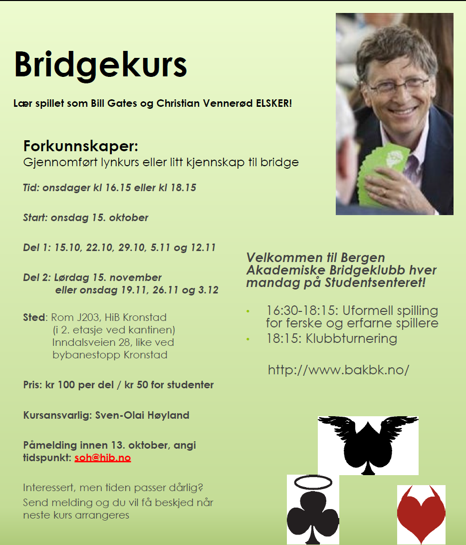 Neste uke møtes vi alle til første ordinære spillekveld, og om det er noen som trenger makker si ifra til Tor Fevang eller meg!