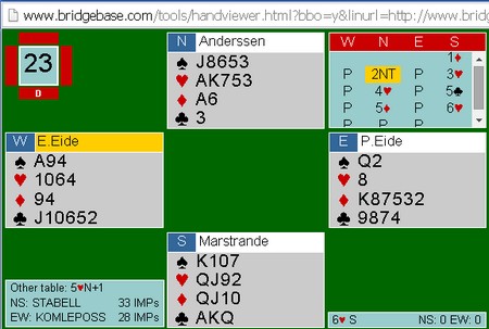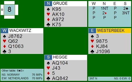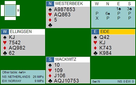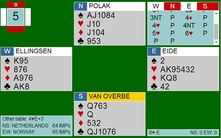 I lagbridge handler det ofte om å melde de rette slemmene. I spillet under kom Nederland bare i utgang, mens Eide- Ellingsen meldte seg lett fram til 6hj. Du ser ikke starten av meldingsforløpet, men det gikk 1hj-2ru-2hj-3hj-3sp fram til Kristian Barstad Ellingsen meldte 3NT ("Jeg er interesssert enda"). Harald var flink når han tok opp enda en gang . Slike slemmer ser veldig lett ut å melde etterpå, men selv om vest har fine honnører er det en tam hånd han har, I første sesjon gikk den ene Nederlenderen amokk og skulle teste gliden. Hadde dette gått bra, ville han hatt et gedigent mentalt overtak. Han gikk fortjent to dobla beiter og masse IMP ut mot 420 norske poeng på det andre bordet. Så løp Hegge - Grude seg inn i et systemhull jeg tror de deler med mange av oss andre. Over 3kl ønsker Kristoffer å komme med en mild sleminvitt i kløver. Han har bare 13 hp, men fine kort hvis de passer med makker sine. Problemet er at 3kl over 2ru vil være spørsmål om videre fordeling og det vil ikke gjøre han så mye klokere, i alle fall hvis han ikke får minst firekort kløver i svar. Derfor hoppa han bare til 3NT. Nederland meldte og vant 6kl. Slik det sitter, spiller ikke den kontrakten seg selv med f.eks et rødt kort ut fra vest. Det er ikke verre enn at etter to ganger trumf, må spillefører passe på å spille spar mot ED to ganger sånn at ikke en honnør blir stjålet, fordi da kan øst spille sin fjerde trumf og syd ble hengende med en spartaper. Så var Norge litt heldige når øst meldte inn sparen sin. Da fant vi heldigvis ikke 4-4 i spar, men havna i 5ru i stedet. 4sp kunne ikke vinnes med 5-0 sitsen, men i ruterkontrakt forsvant det små spar på hjerteren: Så kom enda en slem der Norge meldte bra. Det virker som 3sp viser begge minor og da betyr 4kl fra Kristoffer at han har hjerterfarge. Over 5ru gir han makker muligheten til å velge slem med 5NT. Gi Øst en hjerter mer og en spar mindre, så vil de komme i 6hj. På det andre bordet ble Nederland også presset sånn at de kom i hjerterslemmen. Med to ganger ruter i utspill, vokste det fram et hjerterstikk i nord. :-) Nederland kan også melde og blåste ut i denne 25 hp-slemmen i spar. Norge var på vei, men stoppa på 5-trinnet. Denne kontrakten spiller heller ikke seg selv med EK i ruter ut, men det ble tolv stikk på begge bord.