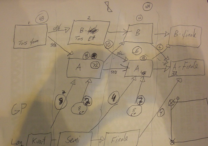 Denne skissen fikk jeg av Sigmund Bakke og det er "flyten" i åpent NM par. Da jeg for noen år siden arrangerte Norway Open i singel i SIB i Kristiansand, fikk jeg tilbakemeldinger om at ingen forsto regler for opprykk og nedrykk mellom puljer. Når jeg ser dette opplegget, sover jeg godt.