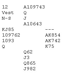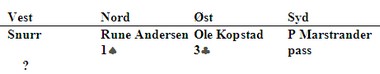 De som så den BBO-sendte kvartfinalen mellom ABAX og Stabell i formiddag, har kanskje nå utpå ettermiddagen kommet seg etter latterkulene. Det var ikke Stabell det var grunn til å le av, fordi det laget spilte veldig bra. Det andre laget, som undertegnede var en del av, spilte ikke så bra. Mildt sagt, noe sluttsifrene 122 - 25 forteller. Etter nå ha blitt rævkjørt i 15 spill, var det klart for det siste. Jeg hørte PC til BBO-operatøren riste av latter da meldingsforløpet var over. Det så ut som jeg og Ole Kopstad hadde en misforståelse, men det hadde vi ikke. Historien er slik og det er med skam jeg forteller. Hadde bloggen min vært en anelse mer serøis enn den er, hadde spillet blitt rammet av både sensurmyndighetene og korrekruttleserstaben. Vi spiller med skjermer og jeg satt på samme side som Peter Marstrander. Jeg alerterte 3kl, men Peter passet med en gang uten å spørre. 3kl viser 5-5 i rødt, men jeg trodde det var sperrebetont i disse soneforholdene. Det er det ikke, har jeg (tydelig) blitt fortalt av makker at det ikke er. Styrken er ubegrenset: Etter omtrent 10 sekunder spør Peter hva 3kl er og jeg forklarer som sant at det viser 5-5 i rødt og en svak hånd. Jeg skal ikke overtolke mine evner til å lese motpartens ansiktsuttrykk, men jeg mener han blunket litt kjappere enn han gjorde i sekundene før. Det stemmer nok ikke. Dessverre fikk jeg denne ideen for meg. "Syd har straffepasset med kløver og en sterk hånd. Siden makker er kort i kløver, har også åpneren kløver. Han vil ikke kunne skjønne at makker har kløver når jeg omgjør makkers Michaels til spill. Hvis dette ressonementet stemmer, står det slem i kløver NS, men de klarer ikke avsløre meg når jeg passer" Som tenkt, så gjort. Jeg passet 3kl og Rune Andersen i nord passet (som "planlagt") Noe av konklusjonen var rett. Det sto slem i spillet, men det var vår vei i hjerter. Mange bord hadde 980 øst-vest, men stakkars Ole Kopstad gikk fem beiter i 3kl. Om det er noen trøst, Ole, så angrer jeg som en hund. Hadde jeg spilt med en makker med dårlig hjerte, kunne jeg blitt anmeldt for drapsforsøk. Unnskyld i all offentlighet, min gode venn!!