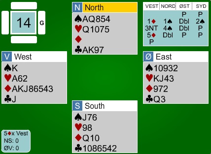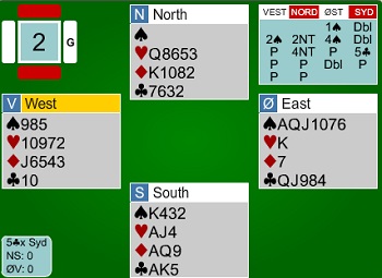 Geir åpna med 1 ruter, og øst går overraskende inn med 1 hjerter. Denne passes selvfølgelig i tempo (noen som trenger lang tenkepause på denne?) i håp om at makker vil doble opp igjen. Makker vet at det sjelden lønner seg med dobla kontrakter på 1-trinnet og kjempa videre med 2 kløver. Jeg hopper til 3 ruter, makker spør om hjerterhold og jeg melder ut i 3NT. Motspillet er optimalt med fire ganger spar ut (sparen sitter 4-4 imot, øst har AKxx) før øst vrir til hjerter. Så er det din tur, hva gjør du nå?