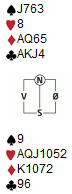 men det er nok dessverre mer rett å si at Norge skyter seg i foten. Det ble rett og slett meldt for mye og for hardt av de norske. I spillet under melder Kristian B Ellingsen steinhardt, i alle fall hvis makker i nord har bare tre spar med sin 2kl. 6sp kunne stått, men gikk et par beiter etter en normal spilleføring Her er det Harald Eide i Nord som jeg tror melder en gang for mye. 2NT er jeg ikke sikker på om de spiller som Lebensohl (overføring til 3kl for å vise en svak hånd) eller Scrable ("Jeg har to steder å spille"). Uansett gikk lyset når han meldte 4NT og ba makker velge minor. Han ble hardt straffet og -1100 mot et par beiter i 4sp x på det andre bordet. Lagene var dyktige i mange spill denne halvrunden og tre 6kl på rad er det lenge siden jeg har sett i en lagkamp. Dette er Nederland sin liste, men Norge kopierte!! Utspillet svingte ni stikk!! Jeg synes Hegge - Grude (over) hadde en fin meldesekvens ØV til 5ru. 4sp kan vel vinnes med forsiktig (og rett) spilleplan, så uttaket i 5ru var veldig rett. På det andre bordet kom ØV (Nederland) i 3NT ! etter et rart meldingsforløp når vest valgte å vise hånda som en balansert 20-21 NT. Kløver ess i utspill og Norge hadde tatt de ni første. Harald Eide startet med derimot med en liten spar og da kunne Nederlanden ta resten siden nord ble skviset i alle farger!! +550 ga bare ett IMP. Nederland er foran med 10 IMP før de siste 14 spillenen.